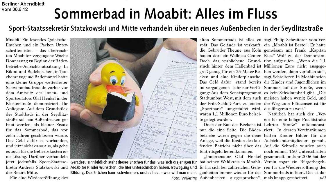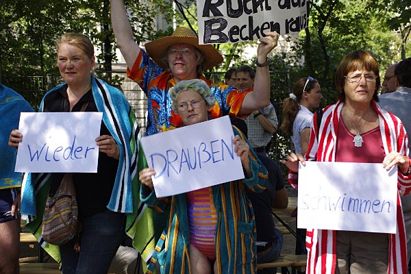 Neue Demo in Badebekleidung am 21.6.12 vor der Senatsverwaltung für Inneres und Sport. Die bei der Demo im September gemalten Bilder und Unterschriften sollen übergeben werden. Treffpunkt: 13:30 Uhr Klosterstraße 47. Der Verein Moabit-ist-Beste hat einige Fakten kurz zusammengestellt. Herr Boesch-Soleil, bei der Senatsverwaltung für die Bäder zuständig, wird gegen 14 Uhr Bilder und Unterschriften entgegennehmen.