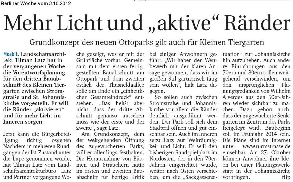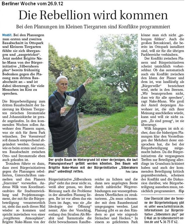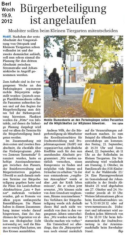 Zwei Artikel zur Bürgerbeteiligung für den Kleinen Tiergarten in der Berliner Woche vom 19.9. und 26.9.12.