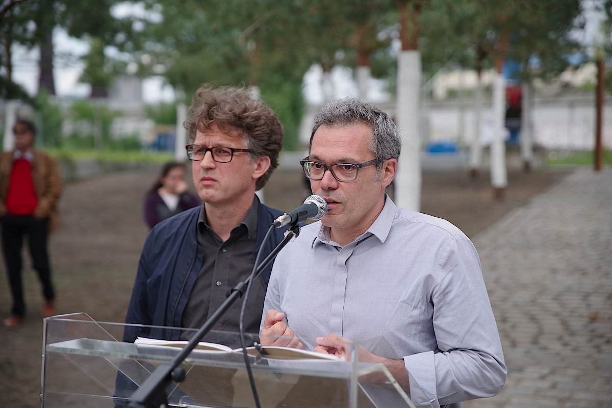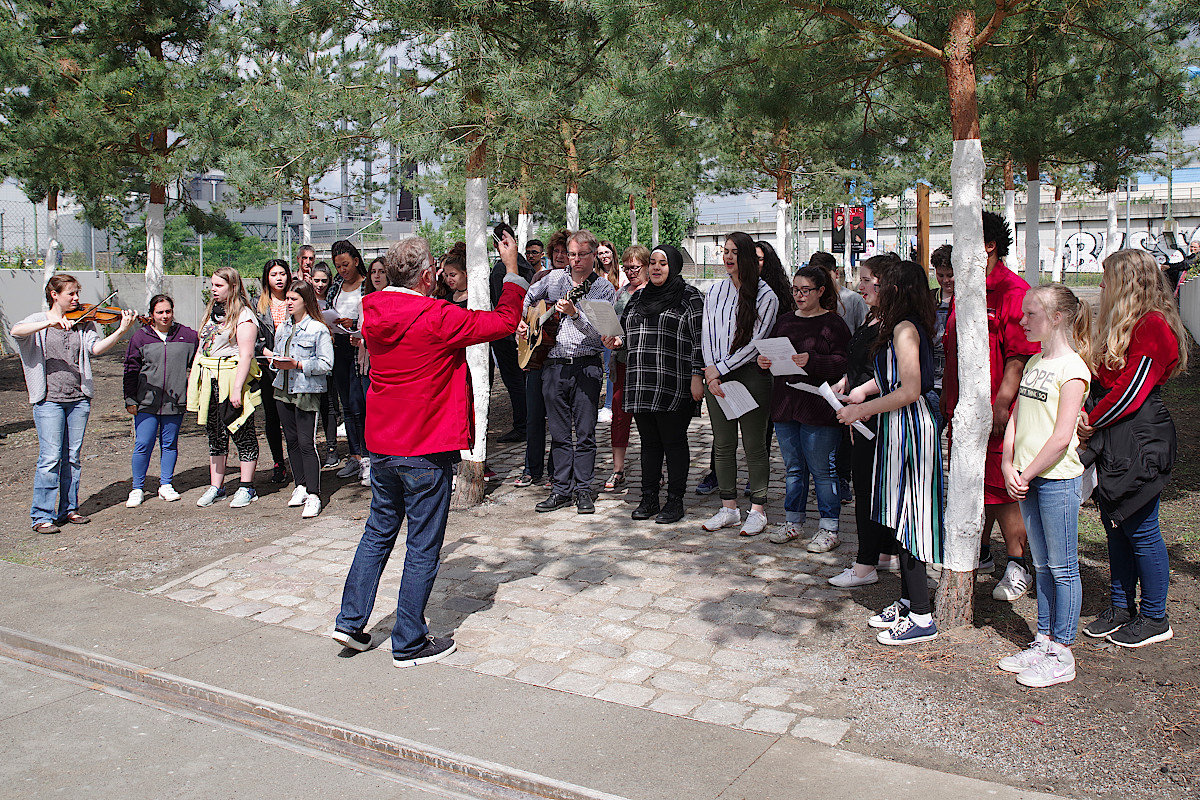 Zur Einweihung des Gedenkortes gestalteten Schülerinnen und Schüler der Theodor-Heuss-Gemeinschaftsschule mit musikalischen Darbietungen eines von Gitarre und Violine begleiteten Chores wie auch durch Lesungen einen würdigen Rahmen für die Redebeiträge von Bezirksstadträtin Sabine Weißler, Prof. Dr. Andreas Nachama, Historiker und Direktor des Dokumentationszentrums Topographie des Terrors und ehemaliger Vorsitzender (1997-2001) der Jüdischen Gemeinde Berlin, sowie Jan Liesegang und Francesco Apuzzo vom Künstlerkollektiv raumlabor berlin, das im vergangenen Jahr den von der Senatsverwaltung für Kultur und Europa durchgeführten Kunstwettbewerb zur Gestaltung des Gedenkortes gewonnen hatte.