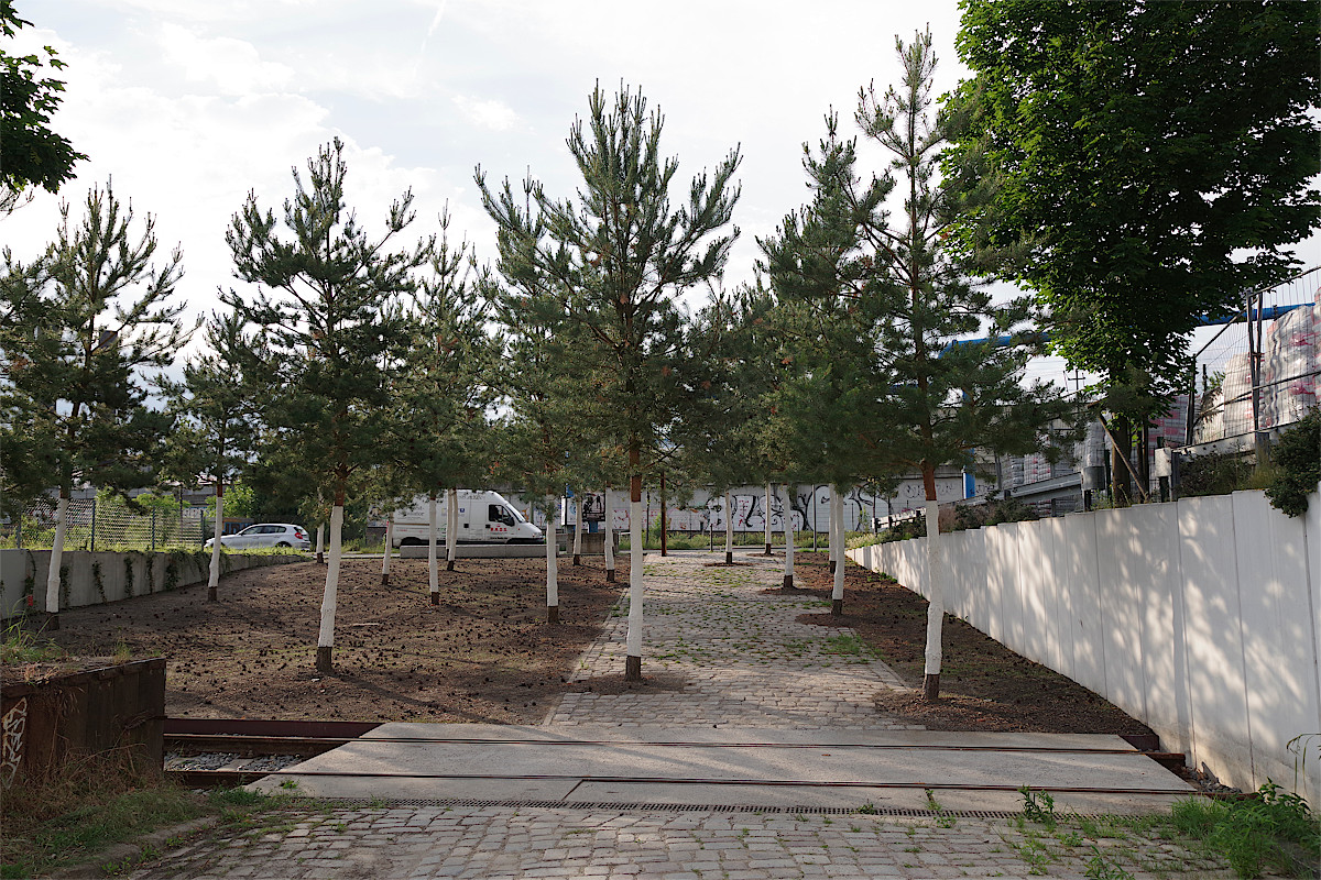 20 Waldkiefern wurden auf der für den Gedenkort verbliebenen – gerade mal 250 Quadratmeter großen – Fläche gepflanzt. Sie stehen dicht, bilden ein scheinbar deplatziertes Element eines Kiefernwaldes und sollen in dem unwirtlichen Raumzusammenhang für Irritation sorgen. Die Stämme der Kiefern, die schon jetzt eine stattliche Höhe aufweisen, sind mit einem Kalkanstrich geweißt – Schülerinnen und Schüler der benachbarten Theodor-Heuss-Gemeinschaftsschule begleiteten die Entstehung des Gedenkortes sowohl mit der Auseinandersetzung mit der Geschichte wie auch mit der Beteiligung am Kalkanstrich. Die Kronen der eng gepflanzten Kiefern bilden schon jetzt die Basis für ein lichtes Dach. Aber nicht nur mit den Augen sehen kann man die Kiefern, sie sprechen auch den Geruchssinn an, eine weitere Irritation in dieser Umgebung, die zur Auseinandersetzung mit dem Ort anregt und zum Verweilen einlädt, z.B. auf einer kleinen steinernen Sitzfläche am Rand zur Ellen-Epstein-Straße, wahlweise mit dem Blick zu den jenseits der Straße gelegenen Gleisen vom Nordring oder durch den Kiefernhain zum Fragment des Deportationsgleises, der historischen Spundwand und dem historischen Stück des Pflasterweges vom Gleisfragment zur Quitzowstraße.