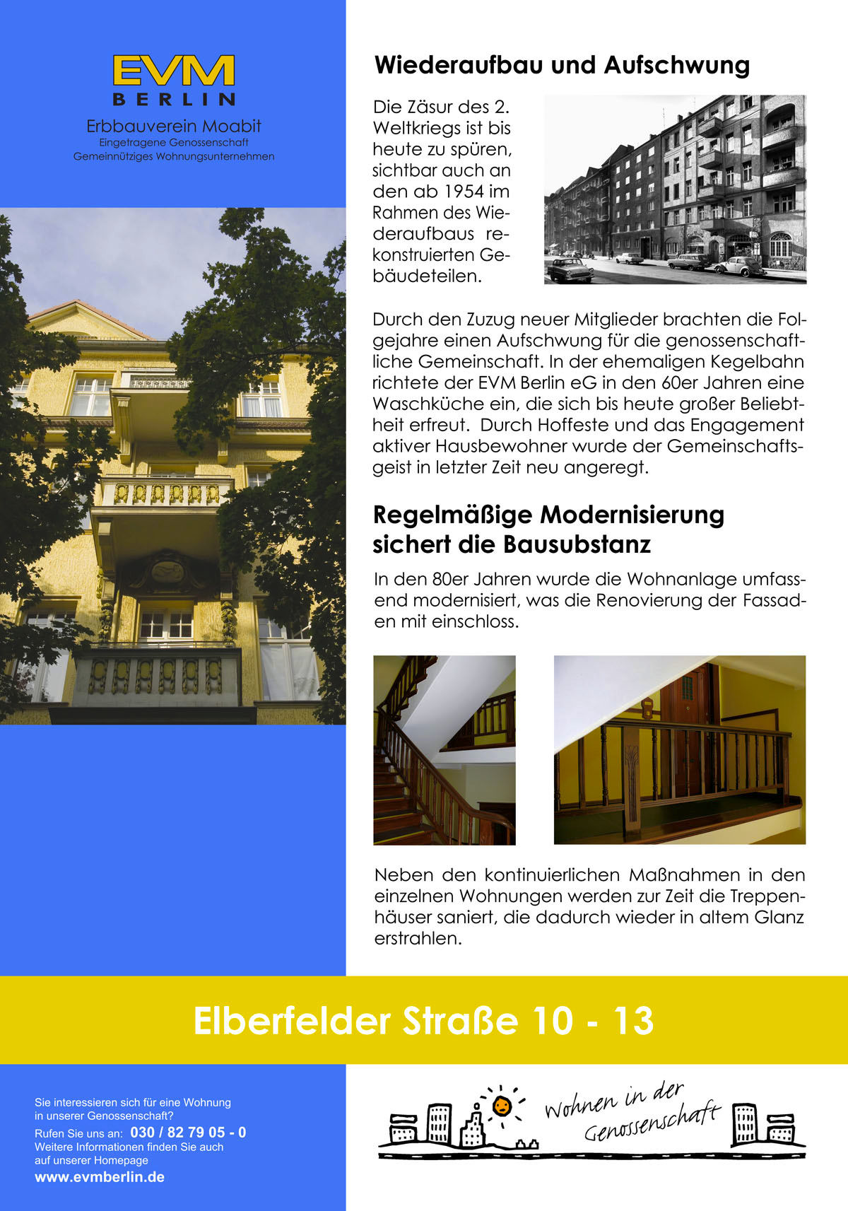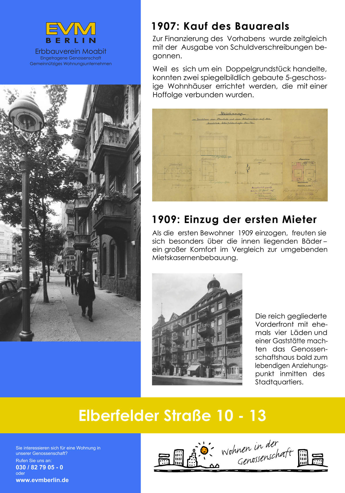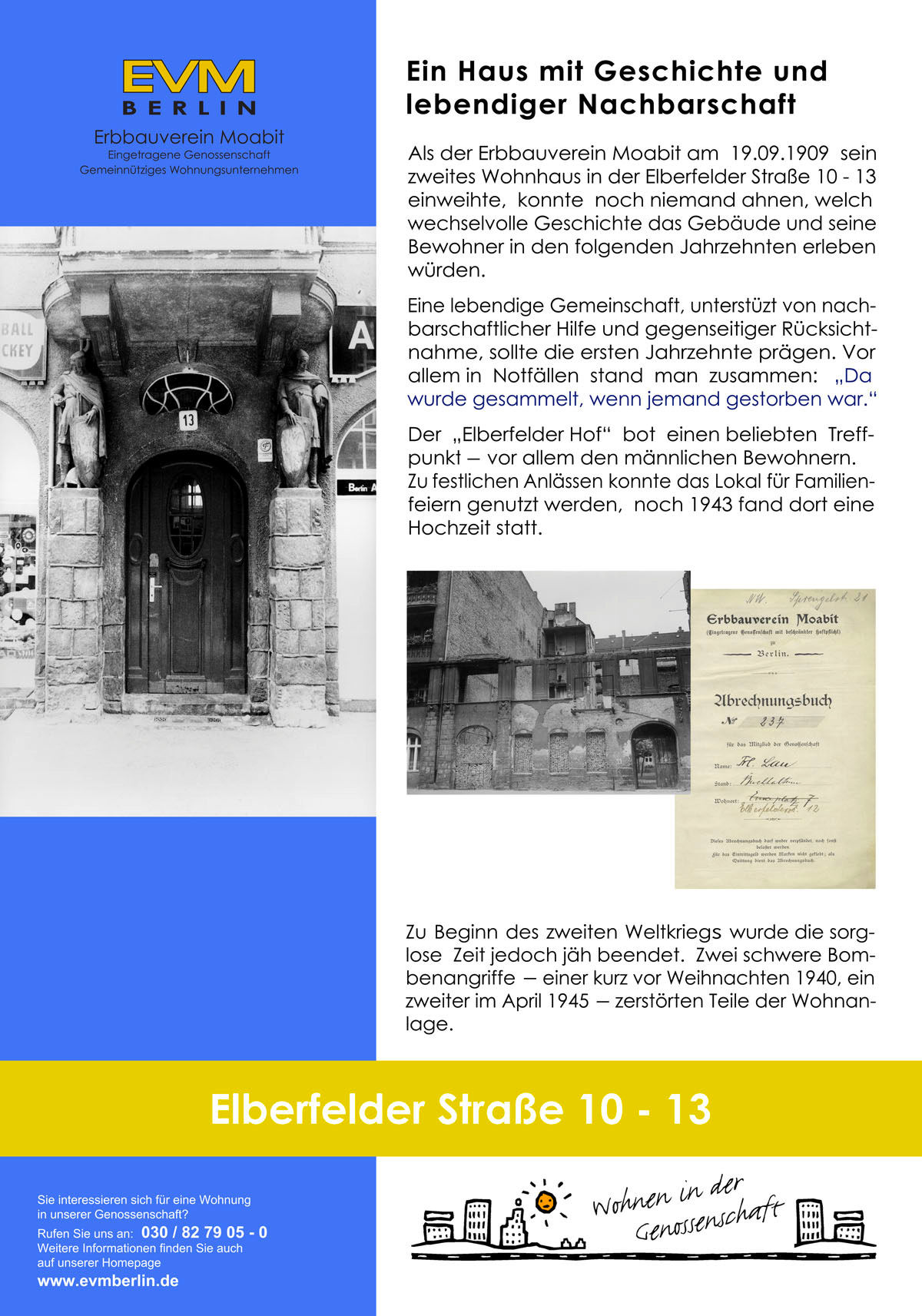 Die Häuser in der Elberfelder Straße 10-13 sind nicht die allerälteste Wohnanlage der EVM Berlin eG, die schon vor längerer Zeit aus dem früheren Erbbauverein Moabit entstanden ist. Deren erstes Haus steht im Wedding in der Sprengelstraße. Aber als zweites Baugrundstück konnten 1909 die Häuser in der Elberfelder Straße 10-13 in Moabit bezogen werden. Die damalige Ausstattung mit innenliegenden Bädern war sehr komfortabel im Gegensatz zu den Moabit damals dominierenden Mietskasernen. Dass heute in der Mitte ein neueres Haus steht, hat mit den Zerstörungen des Zweiten Weltkriegs zu tun, es wurde 1954 im Wiederaufbauprogramm in der Baulücke errichtet.
