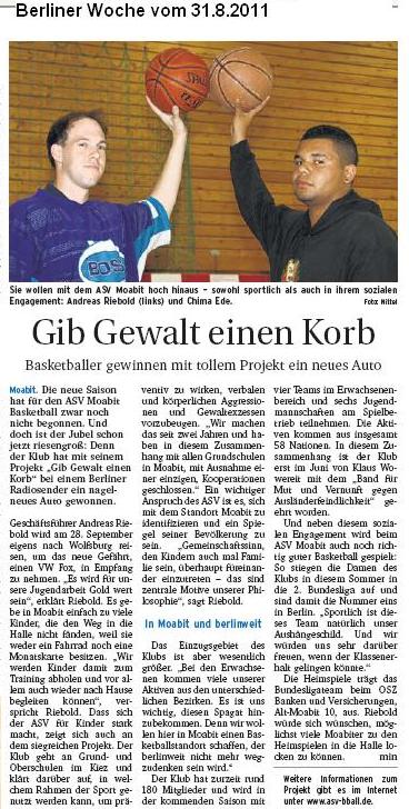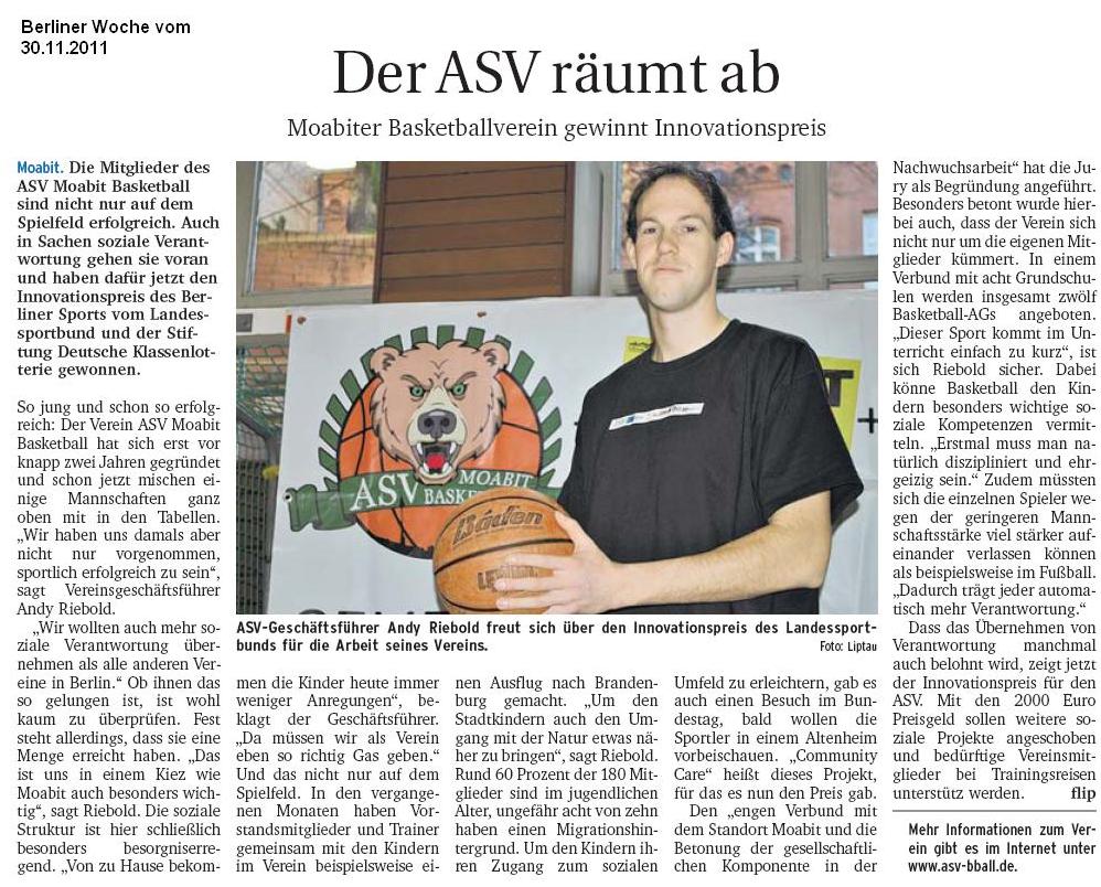 Und noch einen Preis erhält der ASV Basketball, den Innovationspreis des Landessportbunds, s. Berliner Woche vom 30.11.2011.