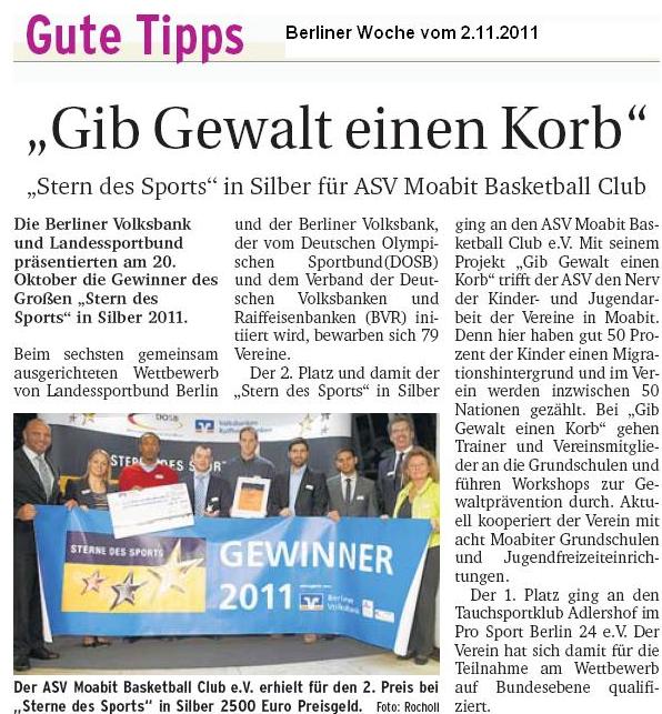 Am 2.11.11 berichtete die Berliner Woche über einen weiteren Preis Stern des Sports für den ASV.