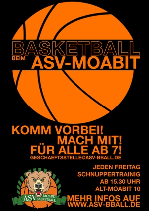 ASV Moabit Basketball e.V., Geschäftsstelle Bredowstraße 31, c/o Wolfgang-Scheunemann-Haus, 10551 Berlin, email: geschaeftsstelle@asv-bball.de , www.asv-bball.de, -Trainingshallen: Alt-Moabit 10 und Gerhardstraße 4