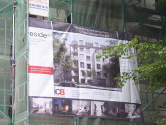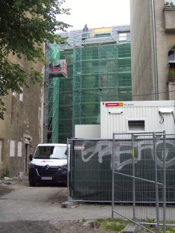 Zugleich läuft - sozial geräuschlos schrittweise - die Räumung des Altbaues, der den Krieg überstand, Vorderhaus-Hälfte, Seiten- und Hinterhausflügel. Ca.15 günstige Altbauwohnungen gehen verloren. Die Fällung des geschützten Baumes folgt einem geplanten Neubau in der Lücke, der Vorrang vor der großen Ulme hat. Klima- und Baumschutz hin oder her. Das vererbte kleine Grundstück im Westfälischen Viertel wird bei schlechter Nordlage nachverdichtet und für Besserverdienende erst von Grün und Mietern befreit und dann vergoldet. Darüber informieren eine Plane am Baugerüst und die Vermarktungsfirma ICB (Immobilien Consulting Berlin) im Internet auf dieser Projektseite.