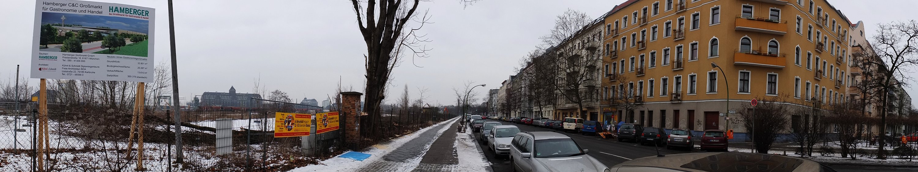 Aber vielleicht will ja die Firma Hamberger doch noch wieder Grün in Moabit schaffen - zumindest auf dem von ihr aufgestellten Bauschild zum Großmarkt sieht's danach aus: Dort ist auf der dem Großmarkt gegenüberliegenden Straßenseite der Siemensstraße eine breite Rasenfläche dargestellt - der Hamberger Großmarkt in einer grünen Idylle.