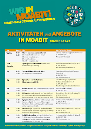 Auf der Webseite des QM Moabit-Ost gibt es einen ausführlichen Bericht über das Quartiersmanagementprojekt "Wir in Moabit - Gemeinsam gesund Älterwerden" von August 2021 mit vielen schönen Fotos der Aktivitäten - lesens- und sehenswert.