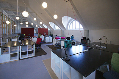 Und so stehen zur Eröffnung nach nur vier Wochen Vorbereitungszeit als erstes ein Bereich mit Coworking Arbeitsplätzen samt notwendiger Büro-Infrastruktur, Konferenzräume, ein Event- und Ausstellungsbereich und ein chill- und Treff-Bereich zur Verfügung. Ein Teil des Mobiliars ist gleichzeitig Produktpräsentation. Den Anfang machen akustische Elemente und Sitzmöbel, die Hartung mit seiner 2010 gegründeten Firma "AGORAphil" über das Internet vertreibt, mit einer Tischlerei ist er gerade im Hinblick auf weitere Schreibtische im Gespräch.