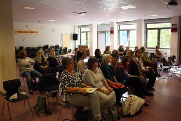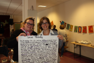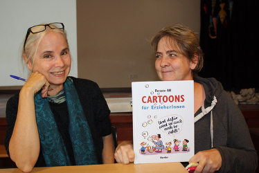Die Ergebnisse aller Workshops wurden in Form einer Power-Point-Karaoke präsentiert. Danach trat als Höhepunkt des Fachtags die Cartoonistin Renate Alf auf. Sie ist vielen in der Branche wohl bekannt, u.a. durch ihren wöchentlichen Cartoon in der Zeitschrift „Kindergarten heute“. Darin und ihren Büchern hält sie den in Kindergärten und Schulen arbeitenden Fachkräften mit ihren Zeichnungen immer wieder humorvoll den Spiegel vor. Das tat sie in der Aula der Kurt-Tucholsky-Schule mit einem Vortrag, der sich vor allem um die unterschiedlichen Aspekte der frühkindlichen Bildung drehte.