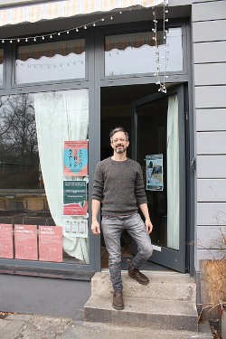 Nimrod Baratz arbeitet gerade am Laptop. Er hatte nur einen kurzen Weg zum Interview, dass im Ladenlokal des Jenseits von Birkenstraße e.V., kurz JVB, stattfindet, denn er wohnt mit seiner Familie oben im Haus in der Turmstraße 10. „Wohnte“ muss man fast sagen, jedenfalls wenn dieser Text erscheint, denn sein Umzug aus diesem Haus steht an. Doch erst einmal dazu, was bisher geschah. Nimrod kam 2016 von Israel nach Deutschland. Er hat deutsche Vorfahren, seine Großeltern sind 1939 aus Berlin geflohen. Nimrod lernte die deutsche Sprache aber erst hier, denn für seine Eltern in Israel war ihre deutsche Herkunft früher mit Scham besetzt.