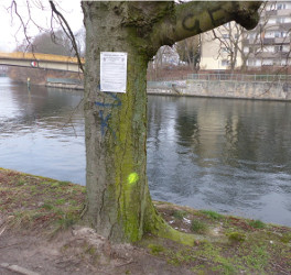 Am 9. Januar waren Anwohner der Flotowstraße und des Schleswiger Ufer durch die Fällung von sechs großen Bäumen am Ufer aufgeschreckt worden. Zwölf von ihnen schlossen sich spontan zusammen, um herauszufinden, was da denn geplant sei. Schnell wurde die Webseite „Rettet das Spreeufer“ gestaltet und eine Petition gestartet. Mit einem Vorher-Nachher-Bild wird die Situation an der Ecke Flotowstraße deutlich unterstrichen.
