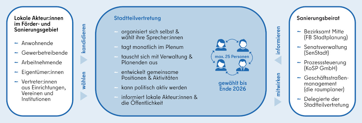 Im April 2024 wird die neue Stadtteilvertretung (StV) Turmstraße gewählt, da die "Amtszeit" der zuletzt im November 2021 konstituierten Stadtteilvertretung abgelaufen ist. Das Gebiet um die Turmstraße ist seit 2011 ein Sanierungsgebiet. Hier werden besondere Fördermittel in die Verbesserung der Infrastruktur investiert. Die Stadtteilvertretung wird von den Bürger:innen des Gebiets demokratisch gewählt und vertritt im Sanierungsgeschehen die Interessen der Gebietsbevölkerung gegenüber der Politik und Verwaltung. Die Stadtteilvertretung Turmstraße wird in diesem Jahr letztmalig neu gewählt, ihre "Amtszeit" läuft bis Ende 2026 .