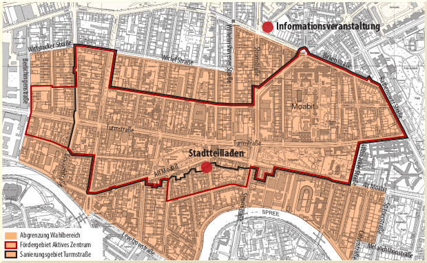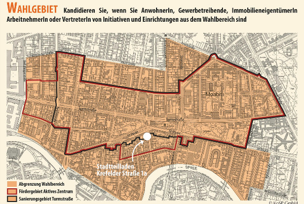 *Als berechtigt an der Kandidatur und an der Wahl zur Stadtteilvertretung Turmstraße gelten Personen, die im markierten Wahlbereich amtlich mit Wohnsitz gemeldet sind, hier eindeutig nachweisbar arbeiten oder sich hier ehrenamtlich engagieren oder über Immobilieneigentum verfügen. Die Identitätsprüfung erfolgt dabei anhand eines gültigen Personalausweises sowie Reisepasses. Der Gebietsnachweis erfolgt entweder per Eintragung der Meldeadresse im Personalausweis, anhand einer gültigen Meldebestätigung, Dienstausweis, Arbeitsvertrag mit eindeutiger Aussage zum Beschäftigungsort, bestätigter Tätigkeitsnachweis, Handelsregisterauszug, Grundbuchauszug zu Immobilieneigentum. Bei Uneindeutigkeit des Gebietsbezuges ist eine Teilnahme an der Wahl zur Stadtteilvertretung Turmstraße nicht möglich.