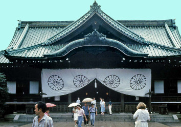 Der Yasukuni-Schrein (sprich: Jasskuni) zeigt auf dem großen Tuch die sechzehnblättrige Chrysantheme, das Symbol des Tenno