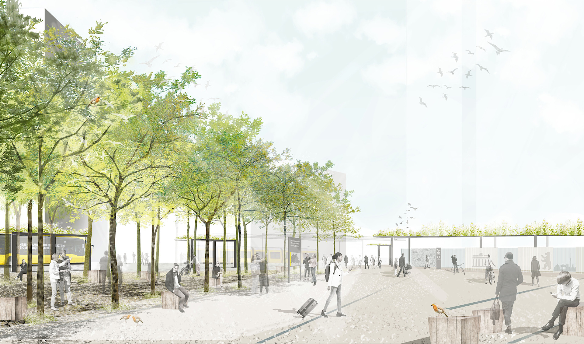 Unter dem Leitbild „Entrée Berlin“ soll ein urbaner, einladender Platzraum mit eine guten Orientierung und atmosphärischen Aufenthaltsorten entstehen. Hauptelement des Konzeptes ist der sogenannte „Grüne Schirm“, der direkt südlich angrenzend an den Bürgersteig der Invalidenstraße angelegt werden soll. Eine unregelmäßige Pflanzung hochstämmiger Bäume soll einen durchlässigen Raum formen, der einerseits eine Abschirmung zur Invalidenstraße herstellt, und andererseits dem „atmosphärischen Aufenthaltsort“ bildet.
