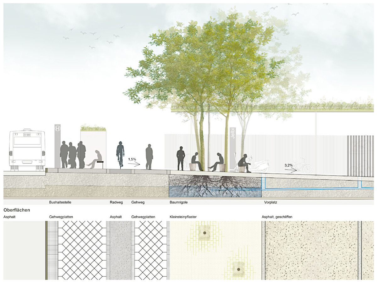Das auf den Platz niedergehende Regenwasser wird in mehreren Schlitzrinnen aufgefangen und größtenteils in den nördlichen Bereich des Platzes geführt wo es im Bereich des „Grünen Schirm“ in einer Speicherrigole gesammelt wird. Die Bäume des „Grüner Schirm“ sollen das Wasser über ihre Wurzeln aufnehmen und über die Baumkronen verdunsten. Damit wird für die unmittelbare Umgebung ein kühlender Effekt entstehen, das Regenwasser vor Ort genutzt und die Kanalisation entlastet. Die Platzoberfläche wird an dieser Stelle so durchlässig wie möglich, aber auch robust und berollbar ausgebildet. Dazu wird im Bereich vom "Grünen Schirm" ein fugenreiches, gesägtes Kalksteinpflaster verlegt, was in seinem Charakter von typischen Berliner Pflasterungen inspiriert ist. Voraussetzung für die Pflanzung ist die Aufgabe der bestehenden Straßenbäume in diesem Bereich, die jedoch bereits jetzt erhebliche Mangelerscheinungen aufgrund schlechter Standortbedingungen aufweisen. Auch ist die Höhenlage dieser Bäume nicht mit der normgerecht hergestellten Einstiegskante (für die Busse) vereinbar, diese soll mit dem jetzigen Konzept auf die Regelhöhe zum barrierefreien Einsteigen angepasst werden.