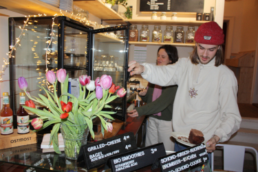 Die Preisgestaltung wurde ausgiebig diskutiert. Ein Kaffee kostet 2,50 Euro, ein Tee 2 Euro, und für ein Stück Kuchen, einen Bagel oder einen Sandwich geben die Gäste etwas in die Spendenbox. KUKUMU arbeitet mit einer Moabiter Bäckerei zusammen. Das Gastronomiekonzept wurde unter anderem von einer angehenden Patisseurin entwickelt. Dazu gehört, dass hier im Café nur Vegetarisches oder Veganes angeboten wird. Die Anforderungen des kleinen Gastronomiebetriebes auf einer Fläche von unter 50 Quadratmetern haben Lukas und sein Team anfangs unterschätzt. Wer steht wann am Tresen und schäumt den Cappuccino? Die regulären Öffnungszeiten an fünf Tagen pro Woche - Mittwoch bis Freitag von 12 bis 18 Uhr und am Wochenende von 10 bis 20 Uhr - verlangen nach einem Dienstplan. Und den gilt es zu vereinbaren mit dem Studium und den bezahlten Jobs der Vereinsmitglieder, die hier allesamt ehrenamtlich arbeiten. Profit wird nicht gemacht. Der Erlös aus dem Verkauf von Speisen und Getränken dient der Mietzahlung und wird reinvestiert.
