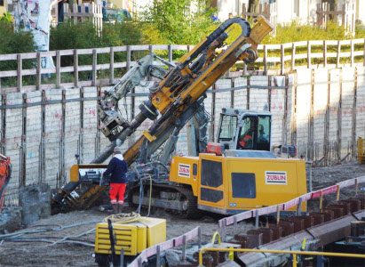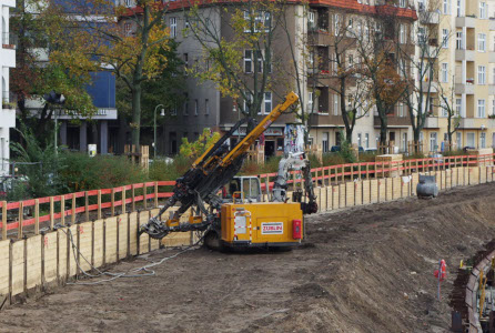 [Bild 4] Mittels dieses Bohrgerätes werden Zuganker gesetzt, die die Trägerbohlwand (Baugrubenwand) sicher rückverankern, damit die Baugrubenwand nach dem Wegbaggern des „Dammes“ nicht in die Spree kippt. November 2019.