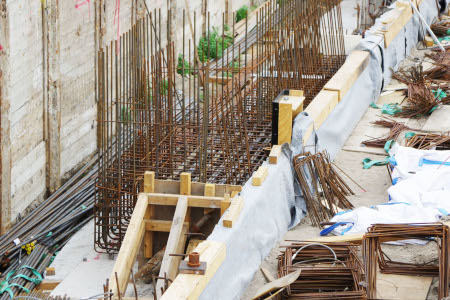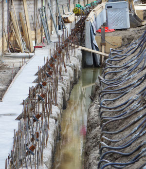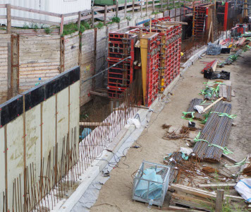 [Bild 11] Auch die neuen Fundamente werden mit Zugankern gegen Kippen gesichert, allerdings sind diese weitaus länger und kräftiger als diejenigen der Trägerbohlwand. Oktober 2020.