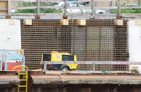 [Bild 13] Auch auf diesem Bild ist der erhebliche Aufwand– auch an Baustahl – zu sehen, um eine standsichere Uferwand zu bauen. Man beachte auch die parallel zur Uferwand unter dem „Drahtgewirr“ sichtbaren kräftigen Bewehrungsstähle, die die einzelnen Bohrpfähle miteinander verbinden. Juni 2021.