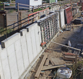 [Bild 16] Die fertig betonierte neue Uferwand – noch ohne ihre Vorsatzschale. Zu ihrer Fixierung sind die oben sichtbaren viereckigen Aussparungen vorhanden. Oktober 2021.