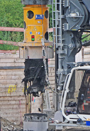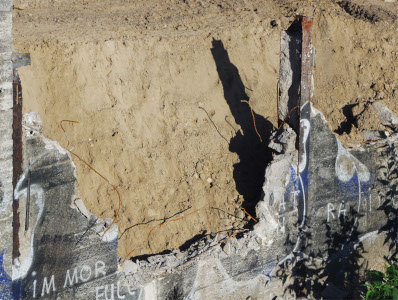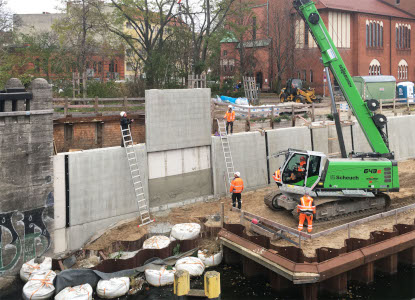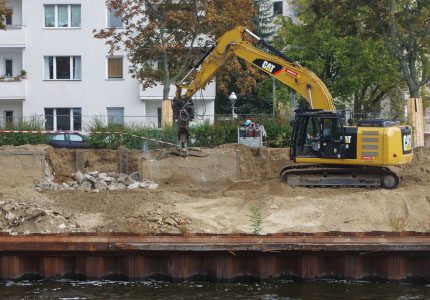 [Bild 2] Der obere Teil der alten Uferwand wird abgerissen, die vorher eingebrachten Träger sind dahinter sichtbar. September 2019.
