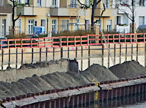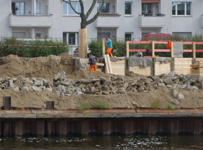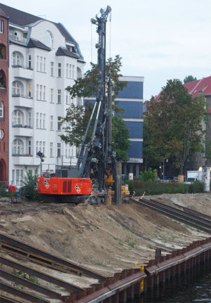 [Bild 1] Die provisorische Ufersicherung in Form einer Spundwand und einer Sandhinterfüllung ist zu einer Art Damm aufgeschüttet worden, die Stahlträger für die Baugrubensicherung liegen bereit, im Hintergrund werden diese Träger hinter der alten Uferwand mit einem Großbohrgerät (der „Bagger“), eingebracht. Der „Damm“ ist notwendig, um ein Wegkippen der schweren Baumaschine zu verhindern. Die Länge der Träger ist deutlich größer als die Einbindetiefe der alten Uferwand, obwohl es sich dabei nur um ein zeitweiliges Provisorium handelt. Diese Träger sind landseitig hinter die alte Uferwand eingebaut worden, um von der Wasserseite die alte Uferwand abreißen und die neue aufbauen zu können.