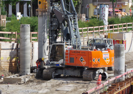 [Bild 5] Mittels eines Großbohrgerätes werden die Bohrpfähle hergestellt, die das endgültige Fundament der neuen Uferwand bilden. Sie überschneiden sich und bilden damit eine sogenannte Bohrpfahlwand. Dabei werden die Röhren nacheinander drehend in den Boden gebohrt und anschließend mittels Spezialgreifer der Boden innerhalb des Rohres entfernt. In das leere Rohr wird dann ein sogenannter Bewehrungskorb (das runde „Drahtgeflecht“) eingestellt und das ganzes unter gleichzeitigem Ziehen des Rohres ausbetoniert. Das direkt vor dem Großbohrgerät liegende Stahlträgergebilde (links im Bild) ist die „Bohrschablone“, um die einzelnen Bohrpfähle korrekt einbringen zu können. August 2020.