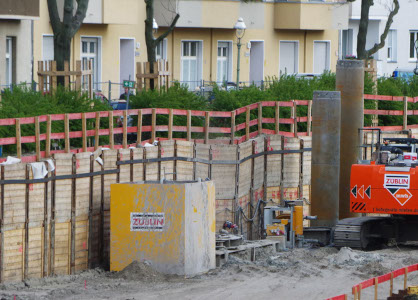[Bild 3] Zwischen die Stahlträger werden Bohlen eingeschoben, diese sogenannte Trägerbohlwand ist die Baugrubensicherung für die folgenden Arbeiten. Die „Lappen“ sind ein Schutzvlies, auch zum Schutz der Wurzeln. September 2019.