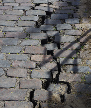 [Bild 7] Und hierbei passierte es: Die Trägerbohlwand sackte stellenweise ab und das Pflaster der Fahrbahn riss auf. Auf dem oberen Bild (November 2019) ist die Trägerbohlwand noch gerade, auf dem unteren (April 2020) hat sie schon eine „gewellte“ Form.