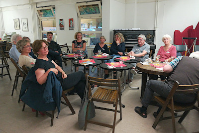 Der Altersdurchschnitt der literaturbegeisterten Teilnehmenden war - wie zu erwarten - eher halb so hoch. Bei Kerzenschein und Räucherstäbchen, Knabberzeug und Obst leiten Eva und Carmen sehr charmant den Austausch über die Lektüre des vergangenen Monats. Auf Wunsch einer Teilnehmerin muss das Geräuchere bald wieder gelöscht werden. In Zweiergesprächen wird intensiv über den Text diskutiert. Dafür finden sich ganz locker die nebeneinander sitzenden Personen zusammen.