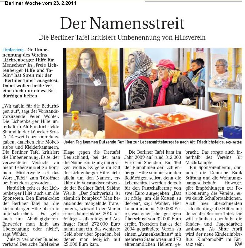 Seit mehr als einem Jahr hat der Verein "Freie Lichtenberger Hilfe und ....?" neben den Ausgabestellen für Lebensmittel, Kleidung, Möbel und Haushaltswaren im Bezirk Lichtenberg auch eine Filiale in der Lübecker Straße 14 eröffnet. Der etwas merkwürdig anmutende Name mit den ... und dem ? erklärt sich aus einer Klage der Berliner Tafel e.V. nach der Umbenennung des 2004 gegründeten Vereins "Lichtenberger Hilfe für Menschen e.V." in "Freie Lichtenberger Hilfe und Tafeln e.V." Über diesen Streit berichtete Katharina Wrobel in der Berliner Woche und da wollen wir uns auch nicht einmischen, sondern einfach nur beschreiben, was in diesem Laden so los ist. Die Lichtenberger Hilfe ist nicht Mitglied im Bundesverband Deutsche Tafel e.V.