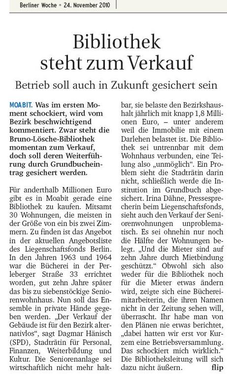 Wenn ich mich richtig erinnere, ist es nicht das erste Mal, dass dieser Neubaukomplex vom Liegenschaftsfonds Berlin zum Verkauf angeboten wird. Vor zwei Jahren wurde kein Käufer gefunden. Kaufpreisvorstellung: 1.5 Mio Euro. Es handelt sich um die freihändige Vergabe zum Verkehrswert. Das Grundstück besteht aus der Bruno-Lösche-Bibliothek, Perleberger Straße 33, erbaut in den Jahren 1963/64 und dem Seniorenwohnhaus Havelberger Straße 1-2, erbaut von 1975 bis 1977. Im Wohnhaus sind 30 Ein- und Zweizimmerwohnungen. Die Hälfte steht zur Zeit leer. Das Haus wurde mit öffentlichen Fördermitteln gebaut, die bereits abgelöst sind. Es unterliegt jedoch weiterhin dem Wohnungsbindungsgesetz. Diese Informationen sind dem Expose zu entnehmen. Was heißt das konkret? Vermutlich heißt es, dass die verbliebenen Mieter für die Dauer von 10 Jahren nicht gekündigt werden dürfen, wie es die Pressesprecherin des Lifo dem Redakteur der Berliner Woche, Ralf Liptau, erläutert hat.