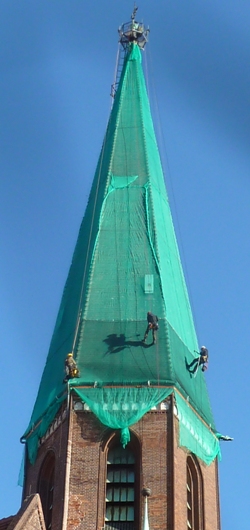 Die Turmspitze der Heilige-Geist-Kirche Perleberger / Ecke Birkenstraße wurde vor etwa eineinhalb Monaten von Industrie-Kletterern mit einem grünen Fangnetz gesichert (siehe auch Vilmoskörtes Artikel "Kirche mit Mütze"). Mit dieser Maßnahme sollen Passanten vor den losen Dachziegeln, die herunterfallen könnten, geschützt werden. Auf der Homepage der Gemeinde sind Fotos von der Dachinspektion zu finden. Die losen Dachziegel sind nicht das erste Problem, immer wieder sind in den letzten Jahren Renovierungsarbeiten notwendig geworden. 2006 wurde die Orgel restauriert. Einige Anwohner/innen werden sich vielleicht daran erinnern, dass vor einiger Zeit der jahrzehntelang gewachsene wilde Wein vom Kirchturm gefallen ist und der Vorplatz deshalb abgesperrt werden musste. Im vergangenen Jahr wurde eine neue Fußbodenheizung in die Kirche eingebaut, nachdem die 100 Jahre alte Dampfheizung kaputt gegangen war. Die Baumaßnahme wurde in diesem Sommer abgeschlossen, seit dem ist die Heilige-Geist-Kirche auch für Rollstuhlfahrer zugänglich. Zur Zeit wird sie abends blau-rot beleuchtet. Die Geschichte dieser Kirche können Sie hier nachlesen. Die Schutzhaube um die Turmspitze wird vermutlich noch für längere Zeit notwendig sein.