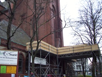 Der Gemeindekirchenrat hat sich entschlossen zur Sicherheit der Passanten einen großen Vorbau auf dem Platz aufzustellen und Seitenbereiche abzusperren. Das Gestell wurde kunstvoll um die dicken Äste der alten Bäume herumgebaut. Das sieht nicht so elegant aus, wie Fangnetze, mit denen an der Heilandskirche jedoch weit mehr hätte eingepackt werden müssen. Aus Kostengründen hat sich der Gemeindekirchenrat für das Gerüst mit Dach entschieden. Denn es kostet nur ein Viertel von dem, was für Fangnetze hätte bezahlt werden müssen. Im Winter kann die Fassade allerdings nicht repariert werden, so dass der Vorbau zur Sicherheit der Passanten und Besucher des Ökomarkts mindestens bis Ostern 2012 stehen bleiben wird.