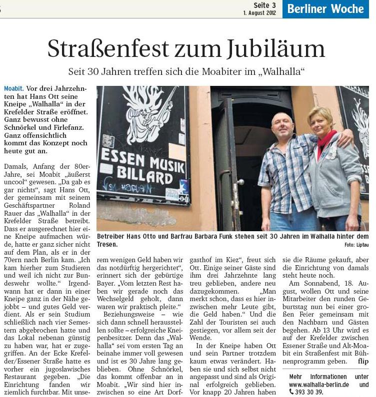 2012 feiert das Walhalla sein 30jähriges Bestehen mit einem Straßenfest in der Krefelder Straße (zwischen Essener und Alt-Moabit) am Samstag, den 18. August ab 13 Uhr. Hier geht's zum Artikel der Berliner Woche.