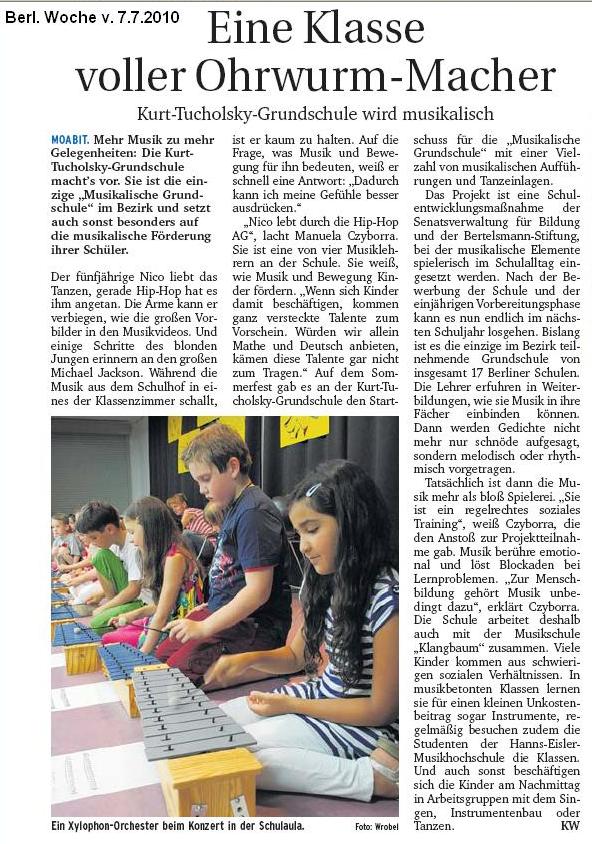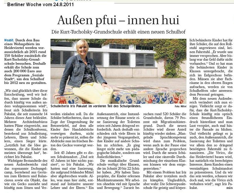 Lesen Sie auch den Artikel in der Berliner Woche vom 7.7.2011 "Eine Klasse voller Ohrwurm-Macher". Am 24.8.2011 ist ein Artikel zur Schulhofumgestaltung der Kurt-Tucholsky-Grundschule aus Mitteln der Sozialen Stadt erschienen.