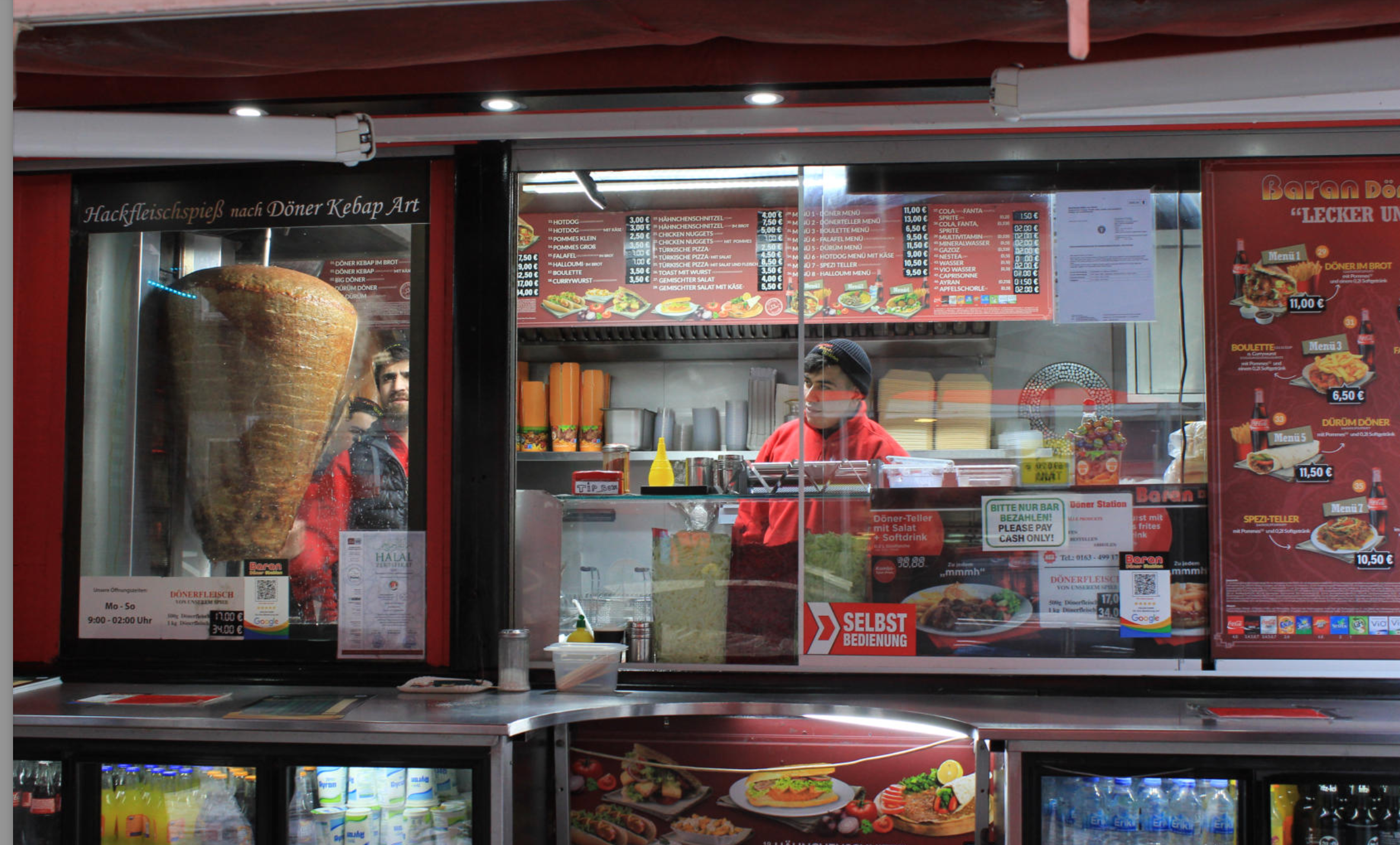 Um dem nachzugehen, fahren wir, mit der Buslinie 123 bis zur Haltestelle Turmstr./Beusselstraße. Auf der Mittelinsel, zwischen Köfte-Spezialitäten, einem DM und einem Rewe, befindet sich der Dönerladen, von dem sie alle reden. Trotz der rot-gelb-schwarzen Verkleidung mit Flammenmotiven geht Baran Döner im bunten Stadtbild beinahe unter. Kein modernes Design, keine auffällige Inszenierung – nur ein schlichter Imbiss, der hier schon seit 20 Jahren Wind, Wetter und Imbiss-Moden trotzt.