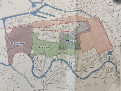 Mohammed und Sehnaz lernen seit März 2025 zuerst einmal den Moabiter Kiez und die hier beheimateten Einrichtungen und Akteure kennen. Das Gebiet, in dem sie tätig sind, ist groß. Auf der Karte zeigen sie, dass es im Prinzip den ganzen Norden von Moabit umfasst, also alles was nördlich der Turmstraße liegt, vom Stephankiez und der Zille-Siedlung ganz im Osten bis hin zum Huttenkiez ganz im Westen. Sie werden dieses große Gebiet als mobiles Team zunächst besonders anhand von bestimmten Ankerorten bespielen. Neben dem Stadtschloss, wo sich auch das Projektbüro befindet, sind das der Moabiter Schulgarten in der Birkenstraße, der Nachbarschaftsladen „Stephans“ und das Café „LouLou“ in der Lübecker Ecke Perleberger Straße.