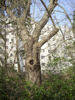 Ihre Hohlräume bieten nicht nur Verstecke und Wohnung für Fledermäuse und Vögel, sondern auch Unterschlupf und Nahrungsgrundlage für viele Kleintiere und Insekten, die wiederum Vögeln als Nahrungsquelle dienen. Das Grünflächenamt lässt in einigen Bereichen abgestorbene Äste, Stämme und Baumstümpfe liegen als Lebensraum für Flechten, Moose und Pilze, Spinnen und andere Insekten. Man spricht dabei heute nicht mehr von Totholz sondern von Biotopholz. Die Stadtnatur-Rangerinnen zeigen mir Höhlen des Haussperlings und in einer alten Linde eine bewohnte Starenhöhle. An ihrem oberen Rand sind die Hackspuren des Spechts zu erkennen. Stare ziehen in bereits existierende Höhlen. Mit ihren Schnäbeln können sich selbst keine hacken.