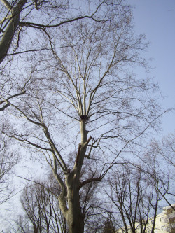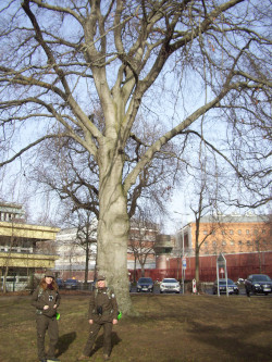 Ein ganz besonders schönes Exemplar ist die große Blutbuche am Eingang von Alt-Moabit, die ein Schild als „Naturdenkmal“ ausweist. In der alten Eibe auf der anderen Seite des Weges entdecken wir ein Stieglitzpärchen, auch dieser Baum ist als Naturdenkmal geschützt.