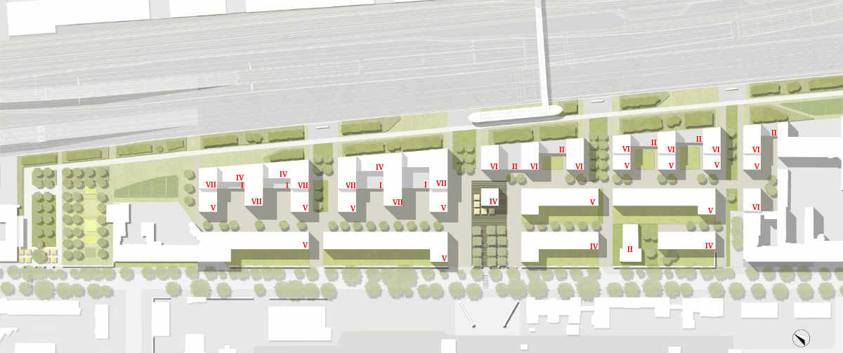 In einigen Details wurde die Planung geändert. Das betrifft allderdings nicht so Grundlegendes wie die vorgesehene Geschossfläche, die gebaut werde soll, nämlich 76.000 Quadratmeter, davon 60% Wohnen und 40% Gewerbe. Auch die vorgesehenen vier Baufelder mit ihren Zufahrten und Tiefgaragen sind nicht verändert. Die Geschosshöhen der Baukörper sind mit roten römischen Zahlen angegeben (den Plan anklicken für eine größere Ansicht). Zur Bahntrasse hin soll generell Dienstleistung und Gewerbe angesiedelt werden, zur Lehrter Straße hin Wohnen. Weitere Nutzungsschwerpunkte sind neu in den Plan aufgenommen worden, im nördlichen Bereich (auf dem Plan links) mehr Gewerbe, im südlichen Bereich (rechts auf dem Plan) vorwiegend Wohnen. Einer der Zwischenriegel ist entfallen und ganz rechts im Anschluss an die bestehende Bebauung ist ein weiterer geschützter Gartenbereich ähnlich wie der hinter der Backsteinmauer entstanden. Auch der zentrale Platz gegenüber des Haupteingangs zum Poststadion ist verändert worden. Hier steht jetzt ein viergeschossiger Würfel, um den sich Geschäfte, Arztpraxen und Gastronomie gruppieren sollen. Damit gibt es eine bessere Verbindung von der Lehrter Straße über die von allen gewollte Brücke über die Bahn ins zukünftige Heidestraßenquartier. Schließlich sollen die Kinder, die dort in Zukunft mal wohnen werden in der Kurt-Tucholsky-Schule an der Rathenower Straße eingeschult werden.