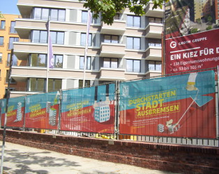 Das lange Werbebanner der Groth Gruppe wurde vor dem 22. Juni wieder abgenommen, da es nicht genehmigt worden war (s. Kommentar Nr. 43). Ab Anfang August hängt es wieder - jetzt statt 18 Mauerfelder "nur noch" 12 Mauerfelder lang. (Update Ende 2016: Banner ist wieder weg, dafür gibt es jetzt Werbung am Flughafen Schönefeld und am Rohbau nach hinten zur Bahn)