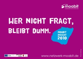 Vom 2. bis zum 11 Juni können sich Schülerinnen und Schüler aus den umliegenden Oberschulen bei 34 Veranstaltungen über Ausbildungs-möglickeiten in Moabit informieren. Mit der Kampagne "MOABIT INSIGHT 2010 - EINBLICK IN DEINE ZUKUNFT" des Unternehmensnetzwerk Moabit laden 26 Moabiter Unternehmen ein, einen Blick in die vielfach unbekannte Arbeitswelt hinter ihren Türen zu werfen. Betriebsbesichtigungen, Vorträge, Gespräche und Ausbildungs-beratung stehen bei insgesamt an diesen Tagen auf dem Programm.