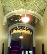Am Haus Kirchstraße 24 ist die Jugendstildekoration der Fassade nicht mehr vorhanden und doch verbirgt sich hinter der Eingangstür (rechts) ein unglaublich reich ausgestatteter Hauseingang. Alle Denkmalbücher sprechen hier von Vestibül, aber wer verwendet diesen Begriff für eine vornehme Eingangshalle heute noch. Blumenornamente um Spiegel, an Decken- und Wandfriesen und stilisiert als Bodenkacheln, marmorvertäfelte Wände unter einer streng wirkenden klassizistischen gewölbten Kasettendecke. Die überreiche Ornamentik zeigt Naturverbundenheit und Lebensfreude des Jugendstils, ein selten erhaltenes Beispiel. Wie mag wohl die Fassade ausgesehen haben? Das Haus wurde vom Architekten der oben genannten Terraingesellschaft, Richard Schirrmacher, 1903-04 errichtet.