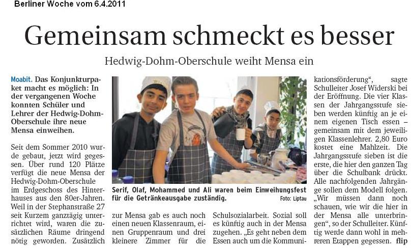 Auch die Berliner Woche berichtete am 6.4.2011 über die neue Mensa.