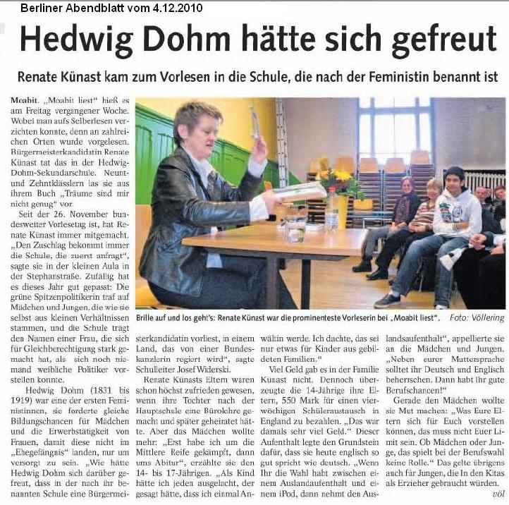 Das Berliner Abendblatt berichtete im Dez. 2010 über die Lesung von Frau Künast in der Hedwig-Dohm-Oberschule.