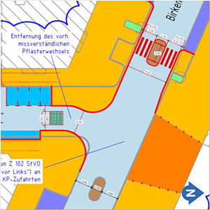 Die Einmündung der Lübecker Straße in die Birkenstraße soll ebenfalls mit einer Fahrbahnverengung umgestaltet werden. Die bestehende „Rechts vor links“-Regelung soll verdeutlicht werde. Ein Fußgängerüberweg über die Birkenstraße soll westlich der Einmündung neu entstehen, sodass das Einkaufszentrum im MoaBogen sicherer fußläufig erreichbar ist. Die Mittelinsel in der Birkenstraße östlich der Einmündung bleibt bestehen.