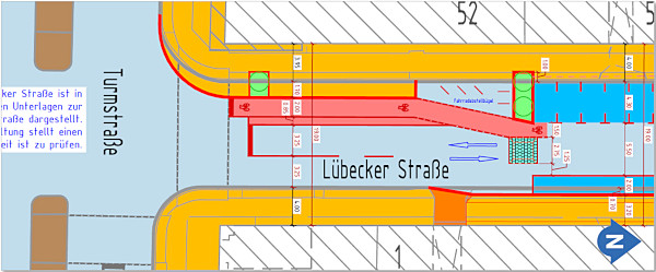 Bei der Einmündung der Lübecker Straße mit der Turmstraße sieht die Planung ab dem Stellplatzbereich für Querparken eine Radspur Richtung Turmstraße vor. Der westliche Gehweg der Straße wird etwas vergrößert. Die Planungen für diese Einmündung stehen noch unter dem Vorbehalt des derzeit noch laufenden Planfeststellungsverfahrens für die künftig durch die Turmstraße führende Straßenbahn.