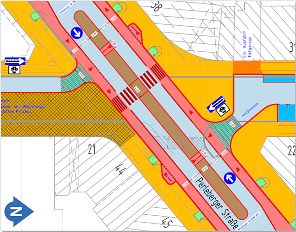 Die resultierende Vorzugslösung von Planer*innen und Bezirksamt: Eine Verkehrsführung mit kurzen Einbahnstraßen am Knoten Perleberger Straße und eine Fahrbahnaufteilung mit Längs- und Querparken bei einer Fahrbahnbreite von 5,5 m. Als weitere geschwindigkeitsdämpfende Maßnahme ist sowohl für den nördlichen wie den südlichen Abschnitt der Lübecker Straße jeweils eine Verschwenkung der Fahrbahn geplant, indem die Seite für Längs- bzw. Querparken getauscht und so die durchgängige Sichtbeziehung verhindert wird. Im Bereich der Fahrbahnversätze soll die Fahrbahn angehoben werden, um auch so zum Langsamfahren aufzufordern, gleichzeitig sind hier Querungsstellen für Fußgänger*innen vorgesehen.